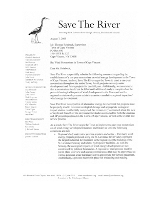 <~~~~~~~~~~~~~~~~~~~~~~~~~~~~~~~~~~~~~~~~~~> <~~~~~~~~~~~~~~~~~~~~~~~~~~~~~~~~~~~~~~~~~~> Wolfe Island bird kills raise wind power concerns . The Bird and Bat mortality rate study from July to December of 2009, at Wolfe Island’s 82-turbine wind farm raised concerns among environmentalists. Wolfe Island is Canadian territory, located where Lake Ontario empties into the St. Lawrence River. This report found 600 birds and more than a thousand bats were killed by the windmill blades in a six month period. Nature Canada called the numbers “shockingly high.” Ornithologist Bill Evans says the real question is which species of birds died. Evans directs Old Bird, Inc. in Ithaca and has consulted for both wind power companies and environmental groups. He told David Sommerstein Wolfe Island is a designated important bird area, so ornithologists predicted high fatalities. Evans says the number of hawks, owls, and other raptors was the most alarming. The newest mortality figures were released Monday by TransAlta, which owns and operates the 86-turbine, 197.8-megawatt facility. A TransAlta environmental services manager was unavailable for comment Tuesday. A consultant's report estimates that 549 birds and 450 bats were killed between Jan. 1 and June 30, 2010. Save The River announced their the 22nd annual Save The River Winter Conference, it is to be held on Saturday, February 5th at the Clayton Opera House. featured in their packed conference agenda ~ “Wind Turbine Impacts on Birds and Bats: Sorting Out the Truth and Moving Forward.” Bill Evans, Executive Director, Old Bird, Inc. Video of Save The River statement Below is a copy of a letter from Save The River to Thomas Rienbeck asking that a moratorium on wind development be established . Their request fell upon deaf ears . Just prior to their sending the August 2009 letter Rienbeck was quoted in the Watertown Daily Times July 10,2009. "“The projects are too far along, I don’t think It’s fair to the wind companies” Mr. Rienbeck said. “We don’t want to suspend those. One is almost complete”.